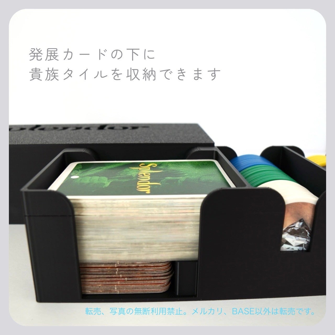 写真のように、カードと宝石タイルを綺麗に収納することができます。オリジナルの箱に比べて1/3のサイズで収納可能です。